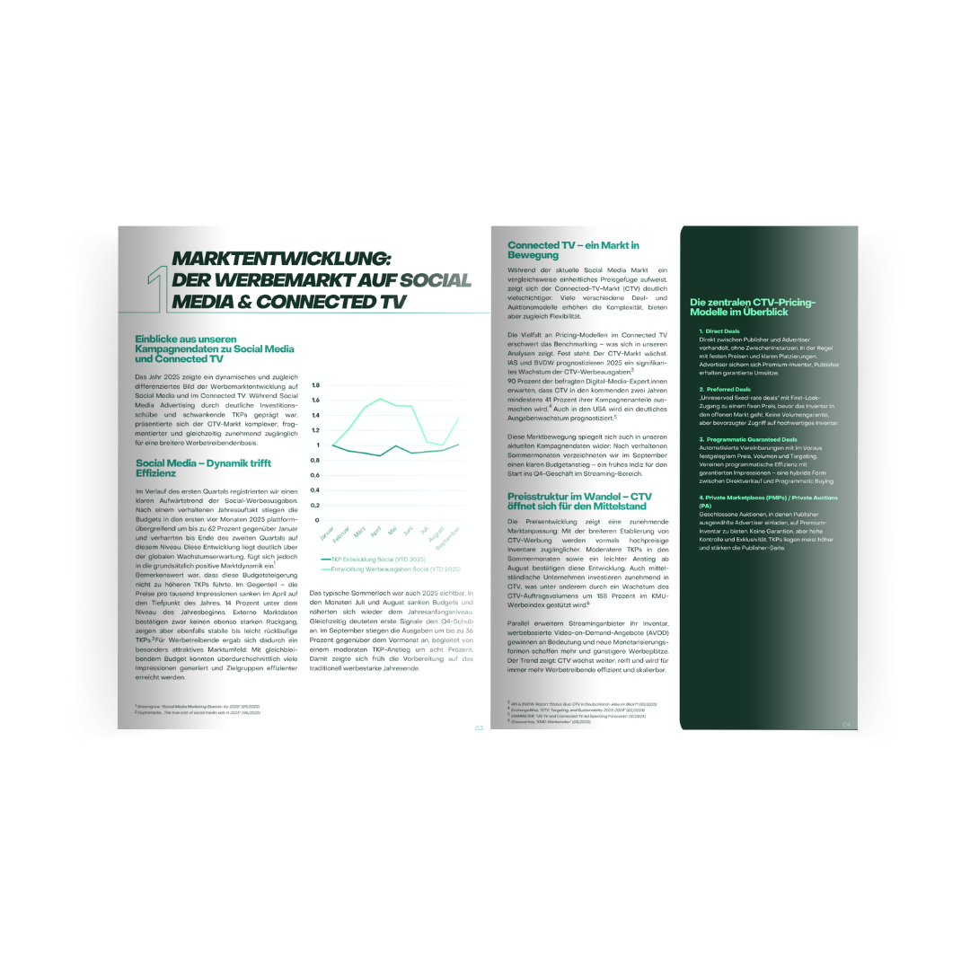 Der CTV-Markt zeigte im gleichen Zeitraum ein anderes Bild: Er war fragmentierter, zugleich aber zunehmend zugänglich. Unterschiedliche Deal- und Auktionsmodelle prägten ein heterogenes Preisgefüge, während AVOD- und FAST-Angebote das Inventar erweiterten und moderatere TKPs ermöglichten. Mittelständische Unternehmen traten stärker in den Markt ein. Nach verhaltenen Sommermonaten stiegen auch die CTV-Budgets im September an und signalisierten einen vorgezogenen Einstieg ins Q4-Geschäft.